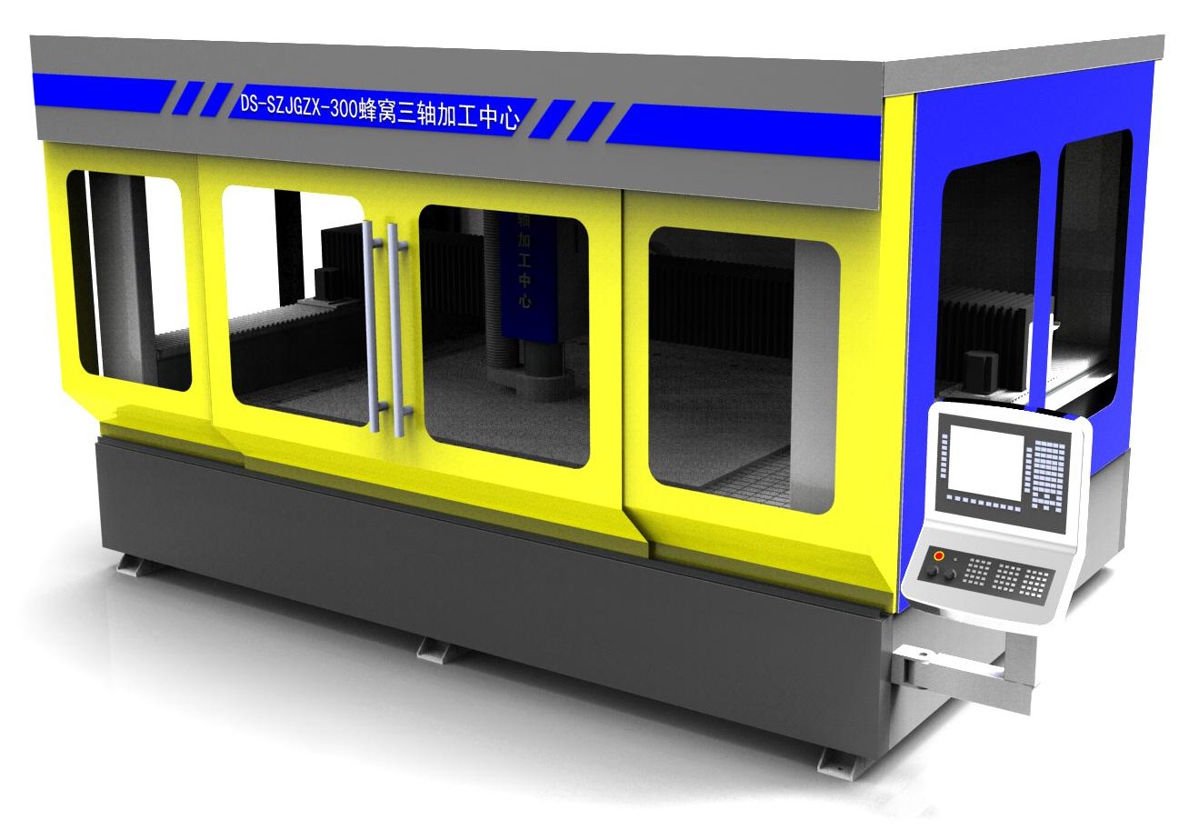 DS-300型蜂窝三轴加工中心: 三轴数控蜂窝加工设备可对芳纶蜂窝芯、铝蜂窝芯材、高密度泡沫等复合材料进行加工, 通过数控编程,按加工材质选配刀具,对固定于工作台上的蜂窝材料,具有非直线型的切割、铣型、倒斜角等加工能力。